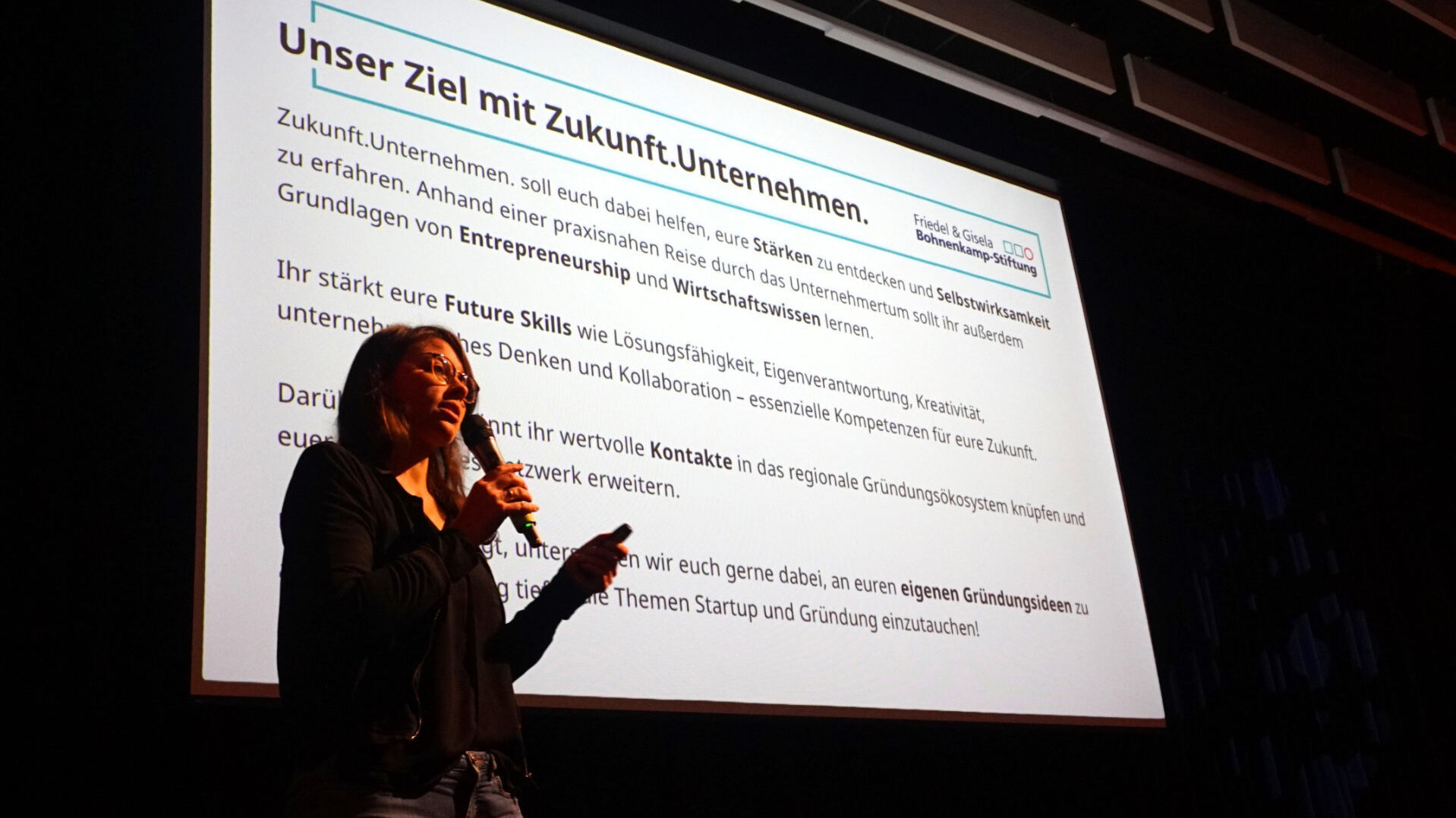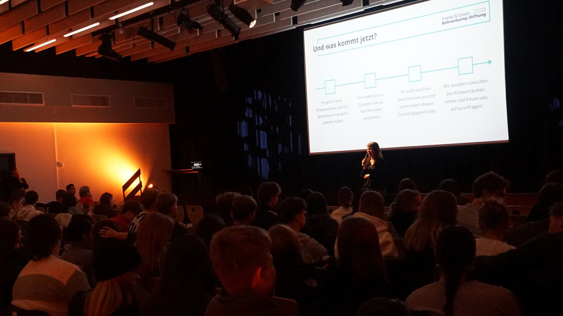 In collaboration with the innovation consultancy tdlc innovation and its founders Katharina Lutermann and Lars Brendler, the foundation has created a diverse program of entrepreneurship education, which has now been launched in the auditorium of the "In der Wüste" secondary school. In five two-hour blocks, year 11 pupils are offered an introduction to the topic of starting a business and entrepreneurship. Each block consists of a mixture of impulses and interactive elements in which what has been learned is applied directly. In addition to the basic knowledge, all participants are given the opportunity and motivated to develop and try out their own business ideas in a team. The project shows ways and possibilities of how these skills can benefit the young people's future careers - be it as entrepreneurs or in any other professional or life environment.