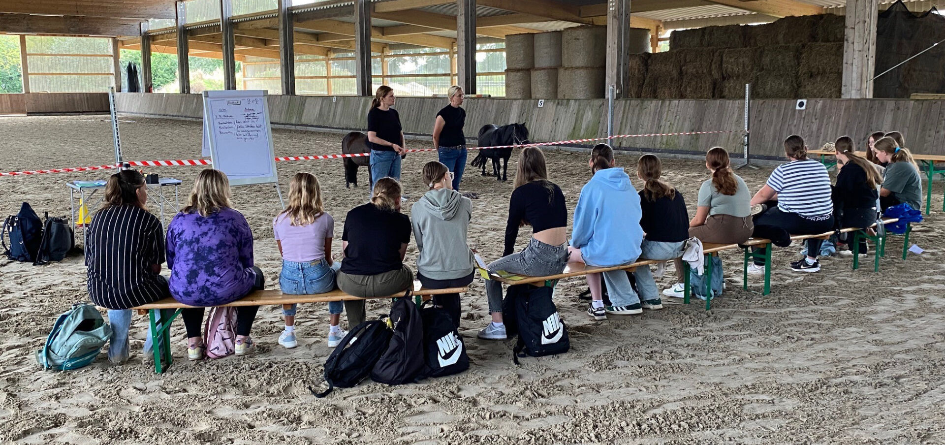 Schülerinnen und Schüler der Jahrgänge 8-10 absolvierten zunächst eine Einzelübung mit dem Pferd an der Hand. Mittels geleiteter Selbstreflexion und dem Feedback der Schülergruppe wurden die Reaktionen des Pferdes für jeden Einzelnen ins Bewusstsein gerückt und die eigenen Stärken dadurch erfahrbar gemacht. Die wahrgenommenen Stärken notierten die Schüler*innen im Anschluss gegenseitig auf sogenannten Mutmachkarten, die sie zu Beginn der Übung ausgewählt hatten. In sich anschließenden Aufgaben für die gesamte Gruppe fanden die Schüler*innen gemeinsam mit den Pferden Lösungen. Durch die Zusammenarbeit wurde schnell deutlich, dass jeder Einzelne zum Gelingen beiträgt, nonverbal viel gesagt wird und es wichtig ist, die Reaktionen des Anderen abzuwarten.